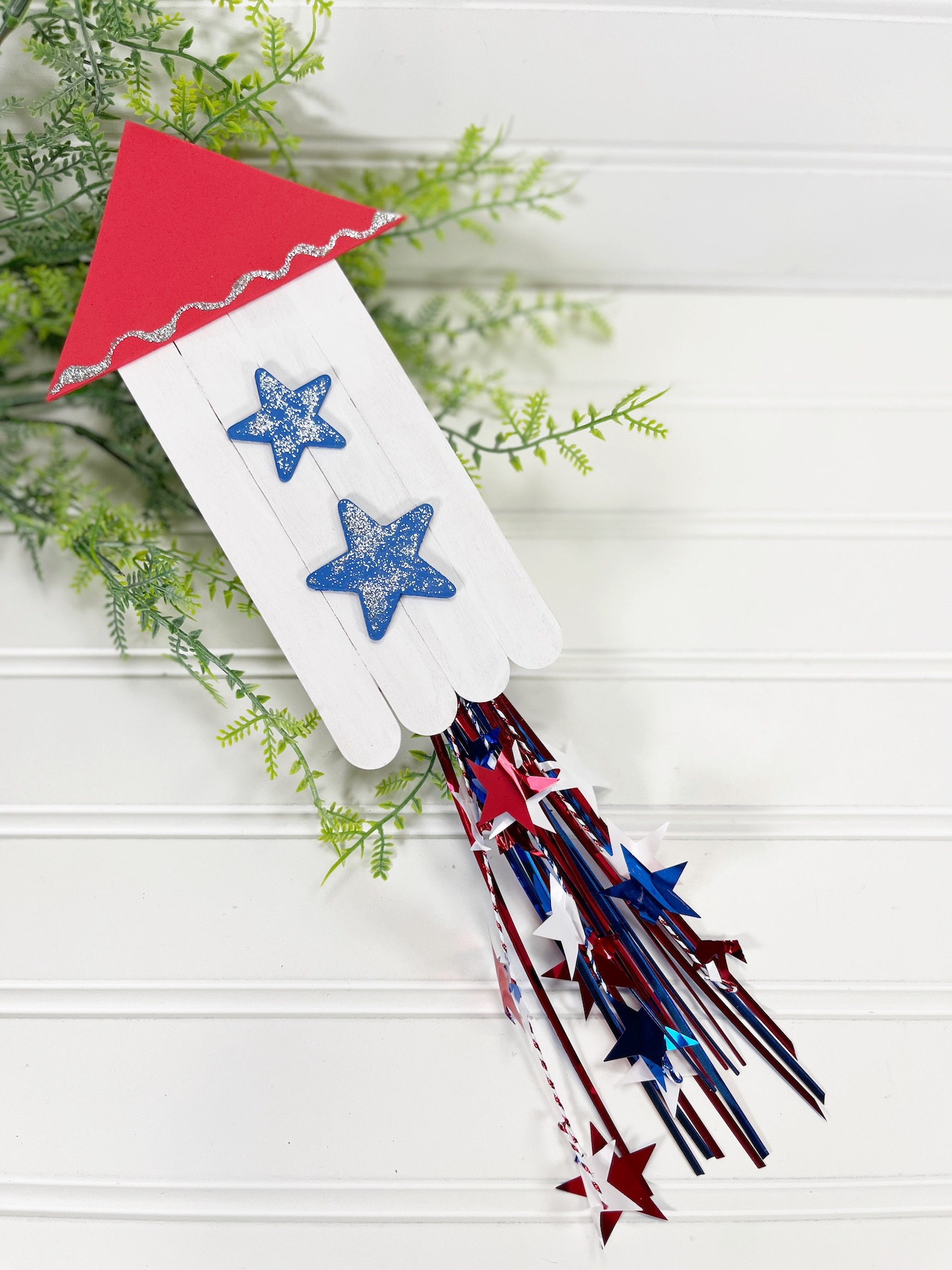 These Fourth of July rockets are so easy to make with craft sticks and Dollar Tree supplies! Perfect patriotic craft for kids!