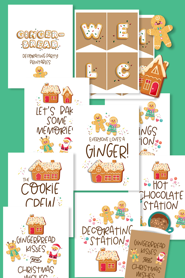 Fun Gingerbread cookie decorating printables! Add a cute and festive touch to your home when making gingerbread houses, baking ginger cookies, or hosting a Christmas cookie exchange!