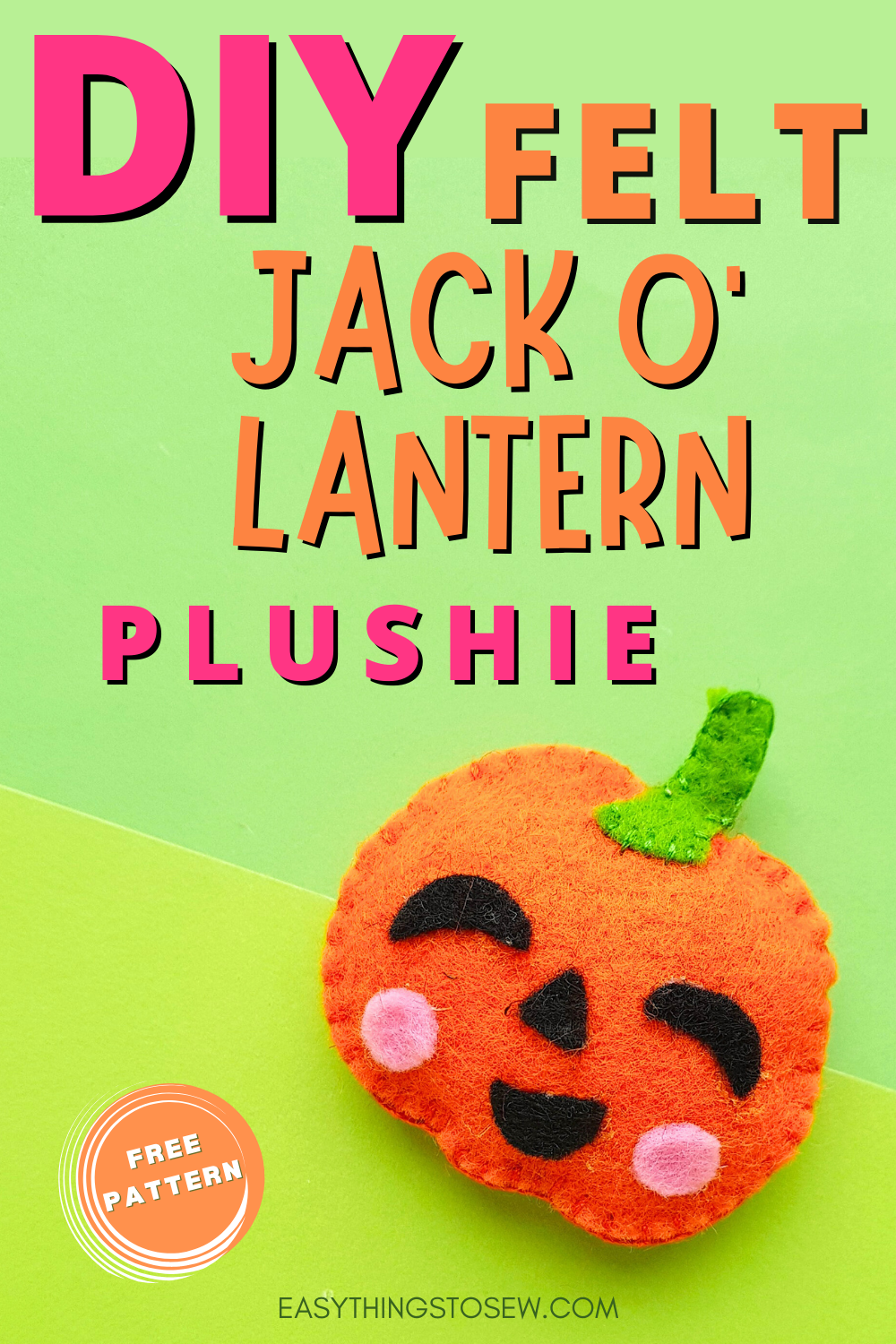 Free pattern to sew a felt Jack o' Lantern plushie for Halloween. Hand sewing project using needle and thread.