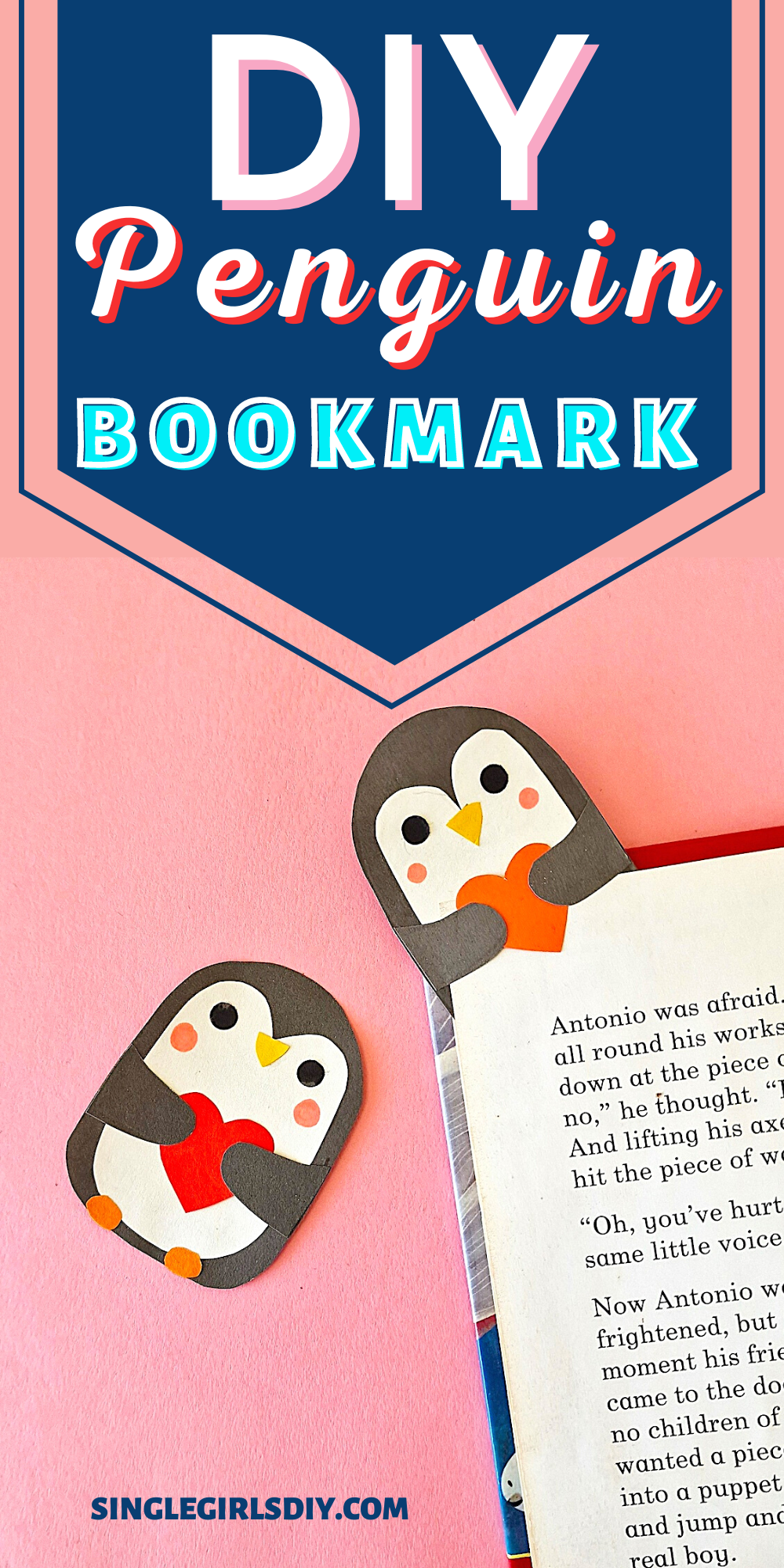 Make a cute penguin bookmark using our free pattern download and craft paper. A perfect DIY Valentines bookmark.