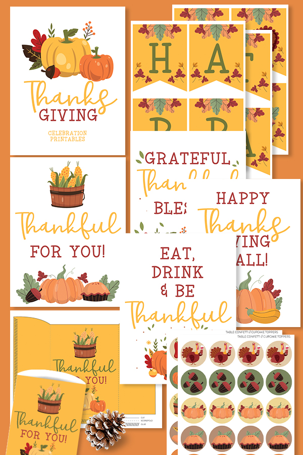 Printable Thanksgiving party decorations to download right now! Colorful banner, signs, stickers, table confetti and a favor box/treat bag.