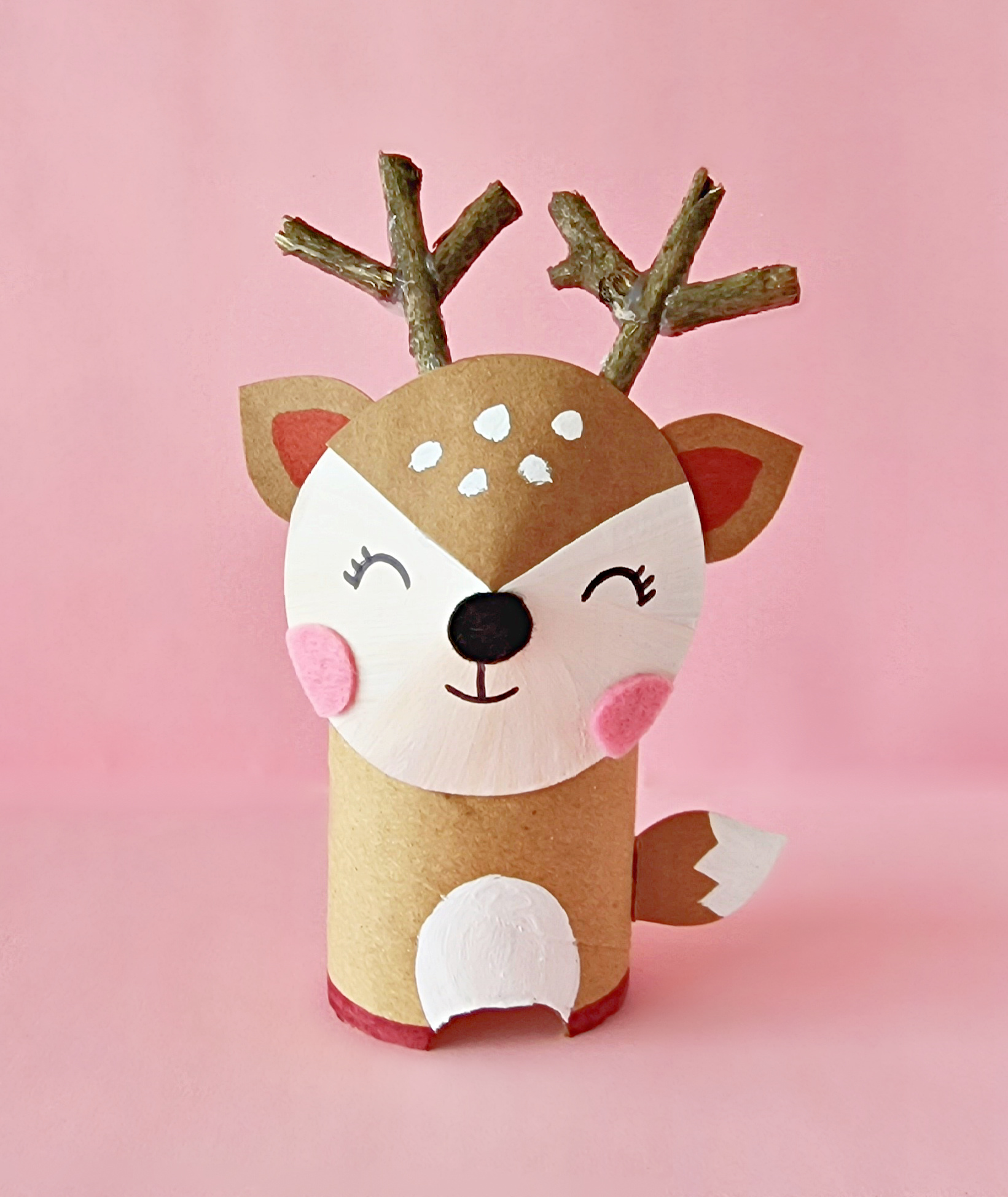 Use our free pattern to make a cute reindeer out of a toilet paper roll. Mixed media craft is fun and easy using recycled materials.