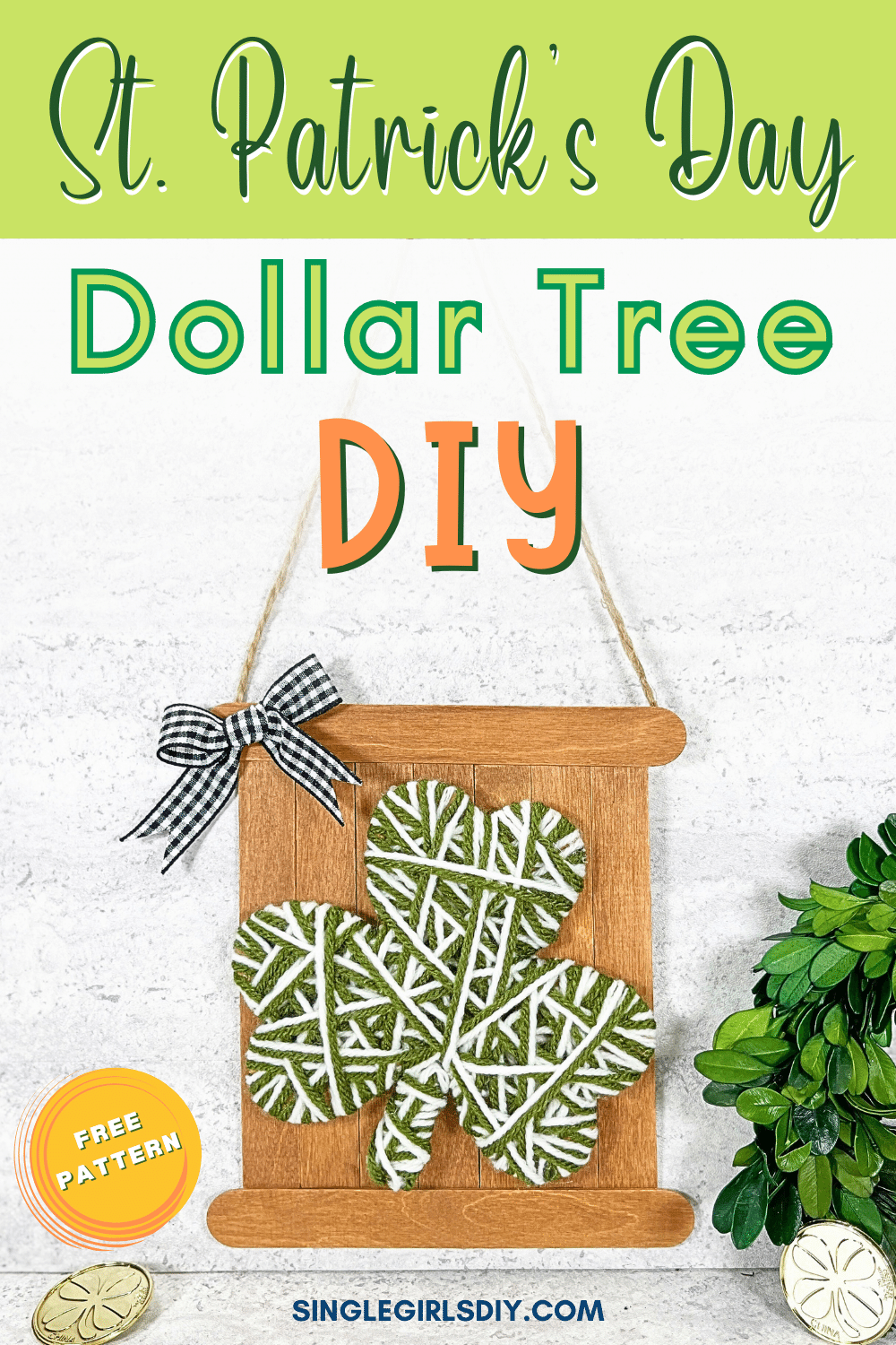 An easy St. Patricks Day decoration. Make a yarn wrapped shamrock sign with our free pattern and dollar store supplies.